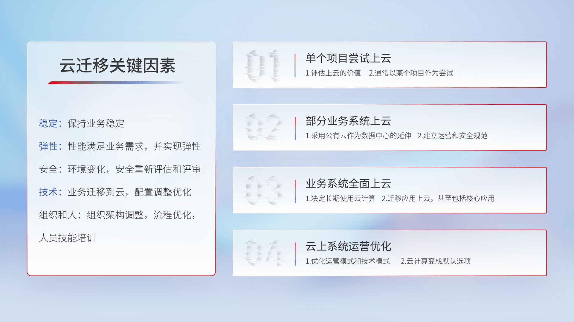 结合实际业务,,,,从规划设计、、、、云平台选型、、云原生改造、、、、数据迁移、、、集成交付,,,迁移全过程为客户识别最佳上云路径,,,做好风险识别管理,,设计网络架构、、身份权限、、安全审计合规、、、操作审计、、、日志审计、、、监控告警策略、、多站点容灾设计等,,,,对云上基础设施进行整体规划,,,提升IT治理水平,,,,以满足弹性、、、高可用、、高性能的需求。。。